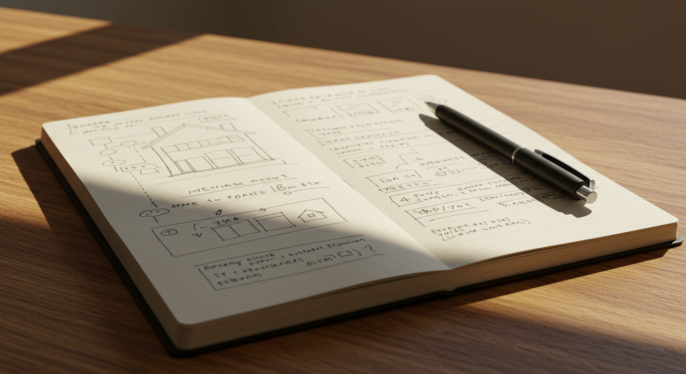 家づくり計画のイメージ。ノートとペンで計画を立てている様子この記事では、マイホーム計画の正しい始め方から、初心者でも失敗しない具体的な手順までを解説します。2025年最新の家づくり事情を踏まえた、実践的なアドバイスをお届けします。